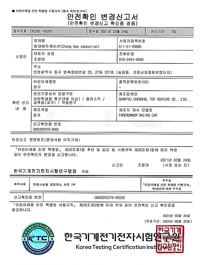 -어린이제품 안전특별법 시행규칙에 따른 안전확인 신고확인증입니다.
